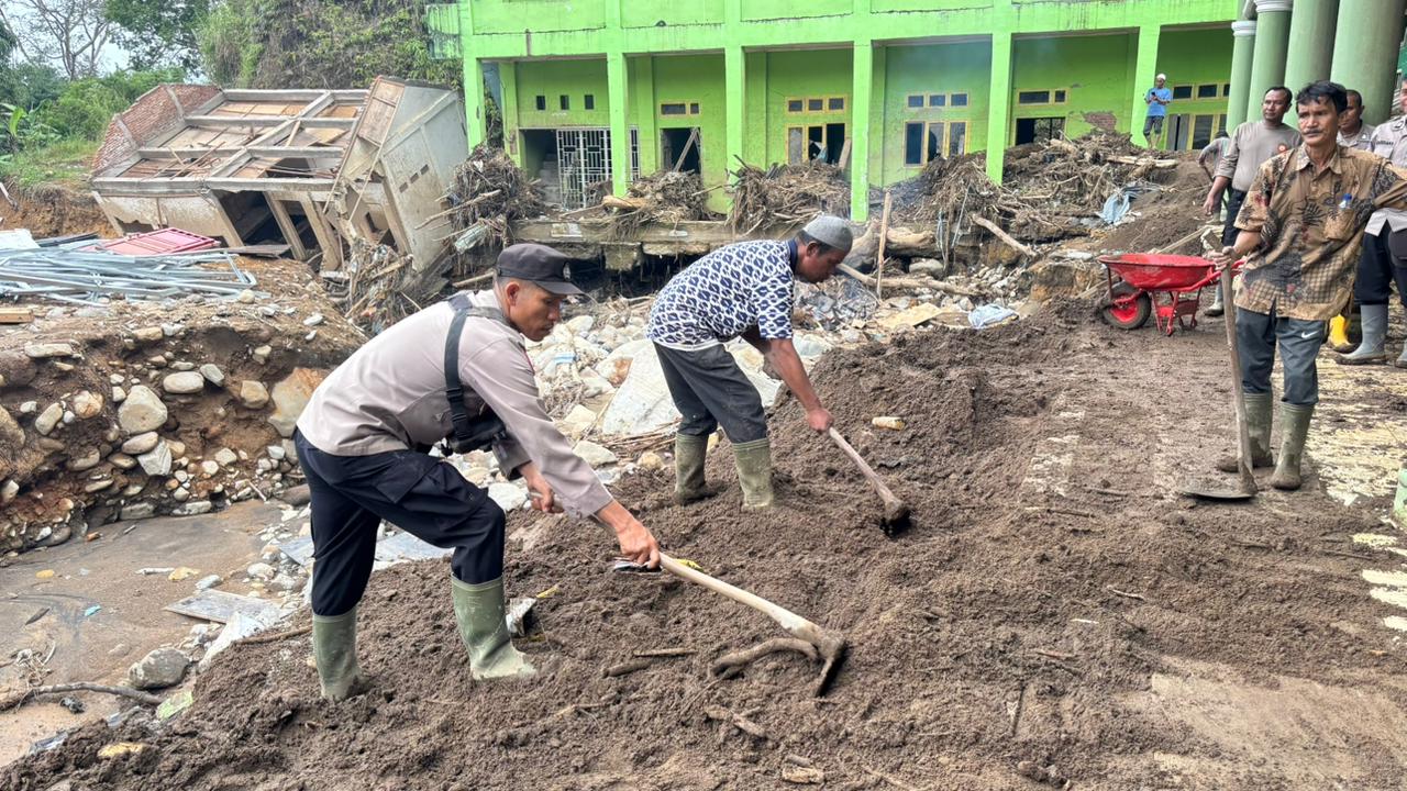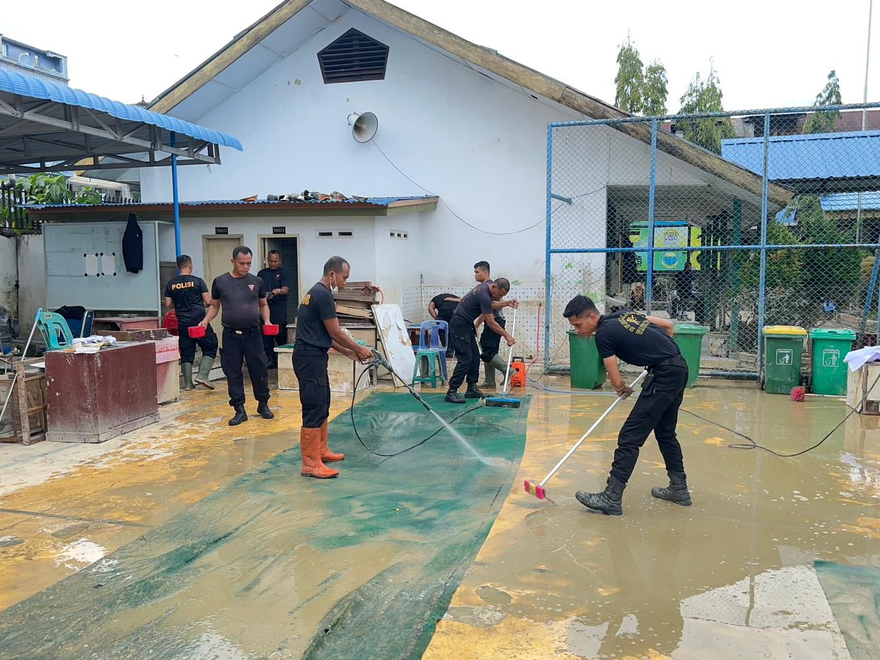 Langkat — Personel Satuan Brimob Polda Sumatera Utara melaksanakan kegiatan pembersihan lingkungan sekolah yang terdampak banjir di SMA Negeri 1…